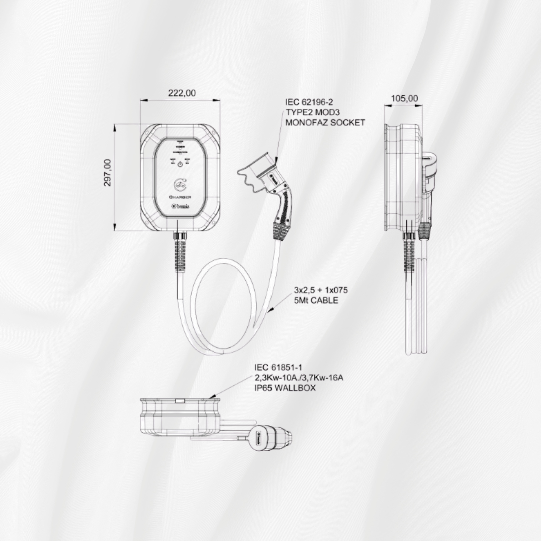 Bemis kalitesiyle üretilen Model 1 Charger 2, elektrikli aracınızı güvenle şarj etmeniz için tasarlanmış, dayanıklılığı ve üst düzey koruma özellikleriyle öne çıkan bir Wallbox şarj istasyonudur. 11kW ve 22kW güç seçenekleri ve 5 metrelik entegre Tip 2 kablosu ile günlük kullanımda size maksimum konfor sağlar.